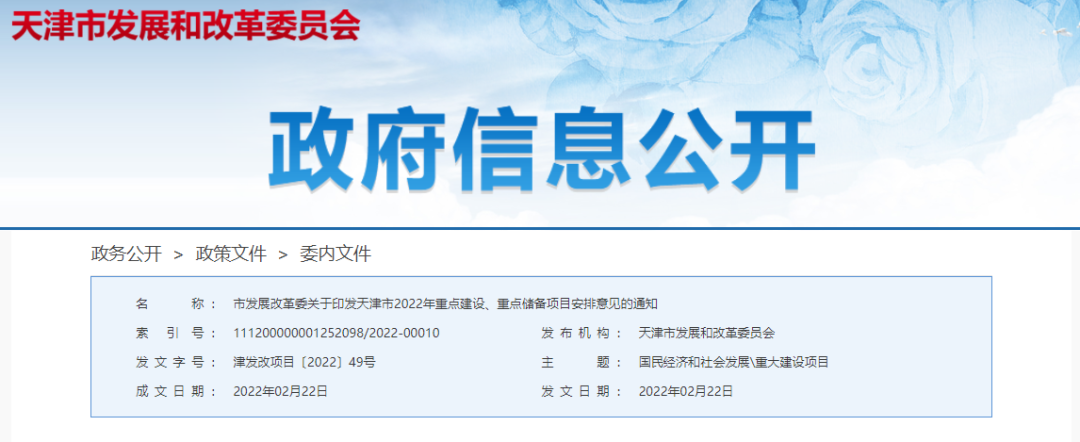 2022年2月22日,天津市發(fā)展改革委印發(fā)《天津市2022年重點建設、重點儲備項目安排意見的通知》,總投資1.8萬億元的676個重點項目清單出爐,投資規(guī)模刷新近年紀錄。其中包括重點建設項目452個,總投資1.17萬億元,年度投資2158億元;重點儲備項目224個,總投資6286.7億元。